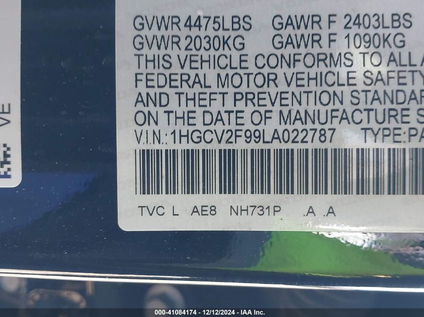 | VIN Number | 1HGCV2F99LA022787 |