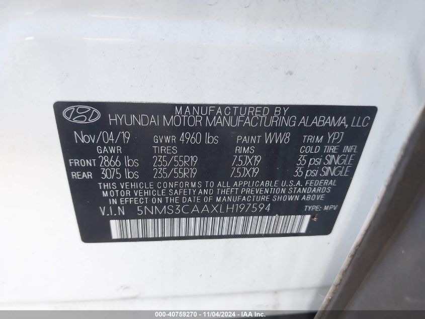 This 2020 HYUNDAI SANTA FE (Unknown Color) comes from a major insurance auction in the USA or Canada. All information on this page is linked to the vehicle’s VIN (5NMS3CAAXLH197594), which helps confirm where the car was listed and what condition it was in at the time of sale.