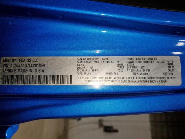 This 2020 JEEP GLADIATOR (BLUE) comes from a major insurance auction in the USA or Canada. All information on this page is linked to the vehicle’s VIN (1C6JJTAG7LL201869), which helps confirm where the car was listed and what condition it was in at the time of sale.