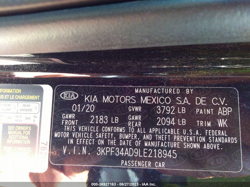 This 2020 Kia Forte (Black) comes from a major insurance auction in the USA or Canada. All information on this page is linked to the vehicle’s VIN (3KPF34AD9LE218945), which helps confirm where the car was listed and what condition it was in at the time of sale.