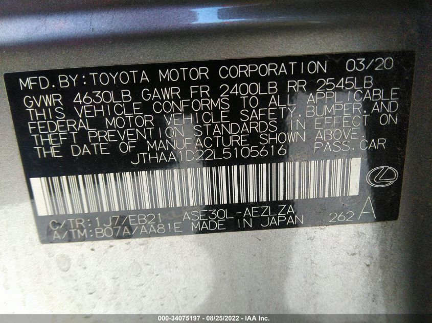 This 2020 Lexus LS (Silver) comes from a major insurance auction in the USA or Canada. All information on this page is linked to the vehicle’s VIN (JTHAA1D22L5105616), which helps confirm where the car was listed and what condition it was in at the time of sale.