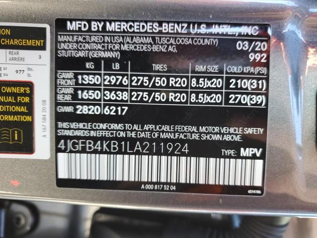 This 2020 Mercedes-Benz GLE-Class (Charcoal) comes from a major insurance auction in the USA or Canada. All information on this page is linked to the vehicle’s VIN (4JGFB4KB1LA211924), which helps confirm where the car was listed and what condition it was in at the time of sale.
