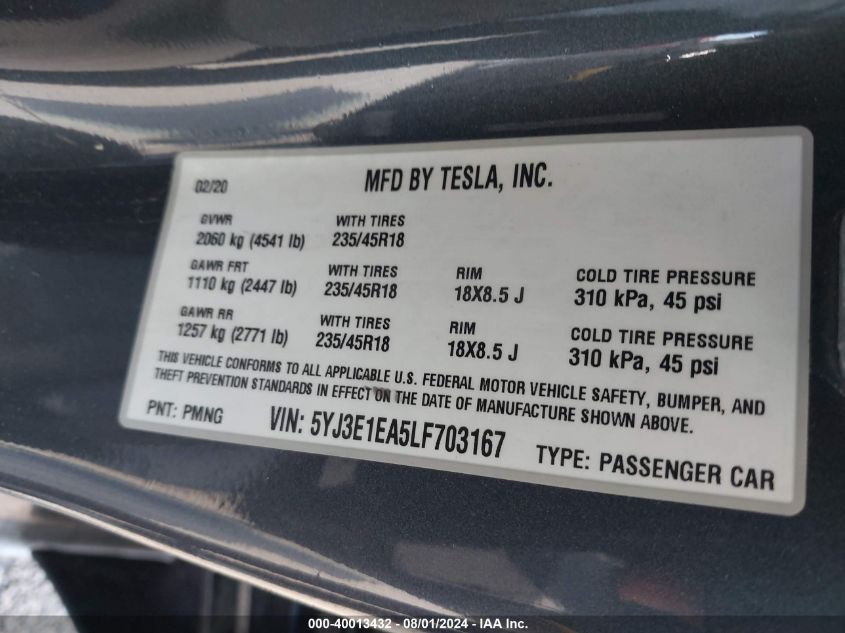 2020 TESLA MODEL 3 – 5YJ3E1EA5LF703167