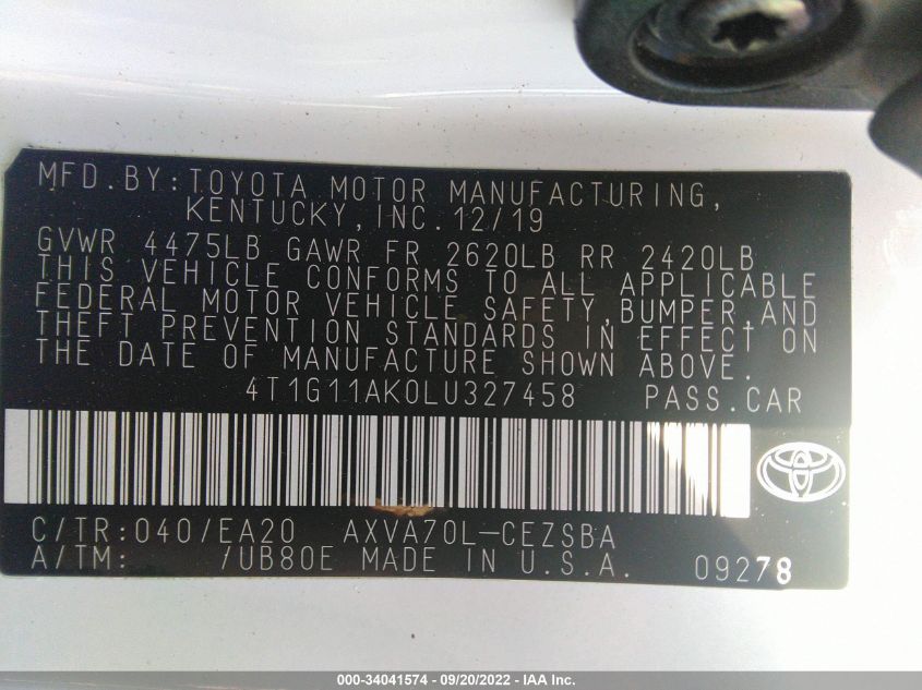 This 2020 TOYOTA CAMRY (Unknown) comes from a major insurance auction in the USA or Canada. All information on this page is linked to the vehicle’s VIN (4T1G11AK0LU327458), which helps confirm where the car was listed and what condition it was in at the time of sale.