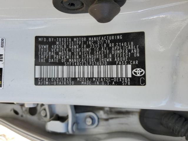 This 2020 Toyota Corolla (White) comes from a major insurance auction in the USA or Canada. All information on this page is linked to the vehicle’s VIN (5YFT4RCE3LP016670), which helps confirm where the car was listed and what condition it was in at the time of sale.