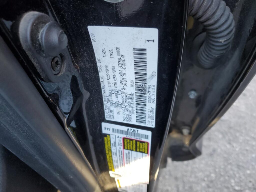 This 2020 TOYOTA TUNDRA (BLACK) is equipped with an engine designed to balance performance and efficiency. According to the auction listing, the vehicle had mileage not provided at the time of sale.