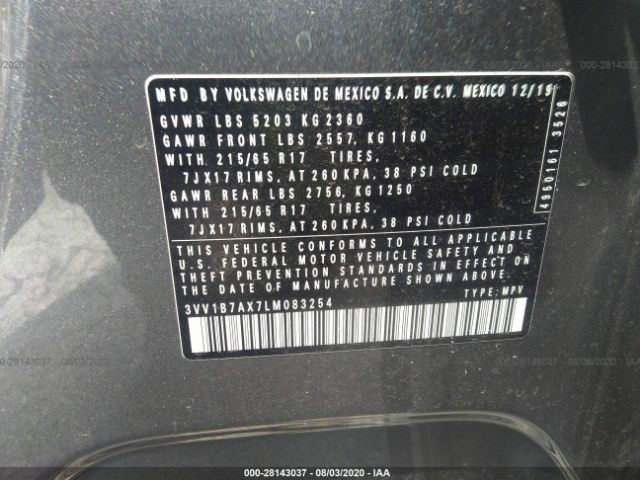 This 2020 Volkswagen Tiguan (Other) comes from a major insurance auction in the USA or Canada. All information on this page is linked to the vehicle’s VIN (3VV1B7AX7LM083254), which helps confirm where the car was listed and what condition it was in at the time of sale.