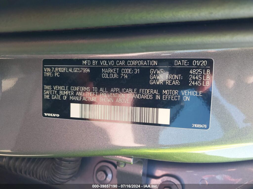 This 2020 Volvo S60 (Other) comes from a major insurance auction in the USA or Canada. All information on this page is linked to the vehicle’s VIN (7JR102FL4LG057994), which helps confirm where the car was listed and what condition it was in at the time of sale.