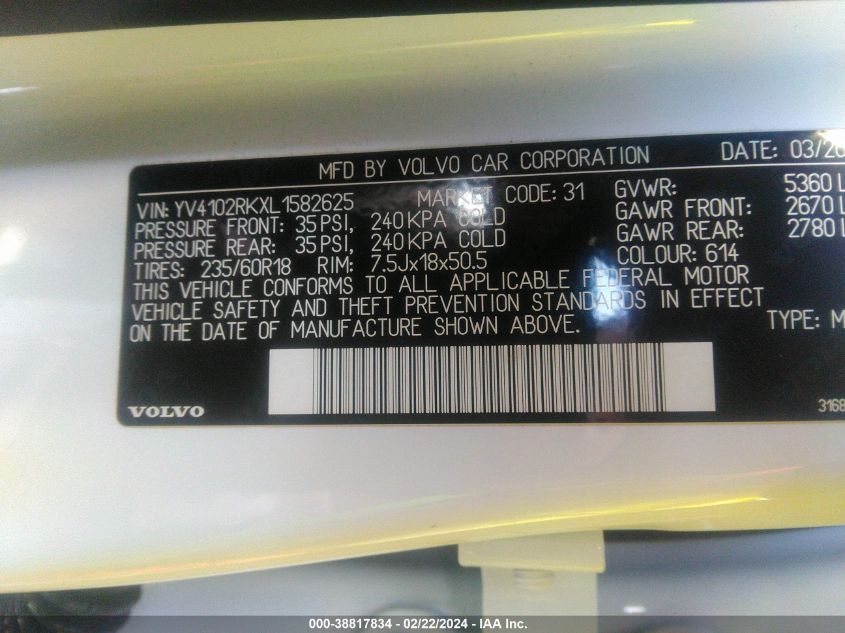 | VIN Number | YV4102RKXL1582625 |