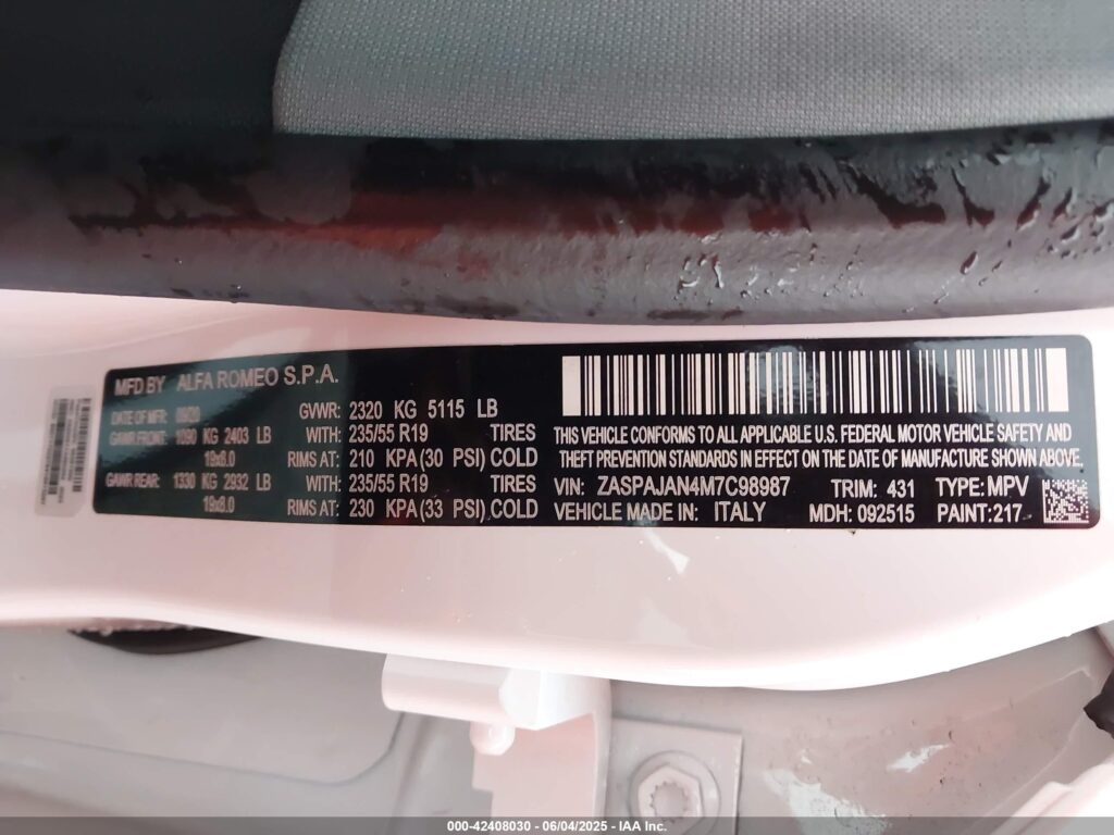 This 2021 Alfa Romeo Stelvio (White) comes from a major insurance auction in the USA or Canada. All information on this page is linked to the vehicle’s VIN (ZASPAJAN4M7C98987), which helps confirm where the car was listed and what condition it was in at the time of sale.
