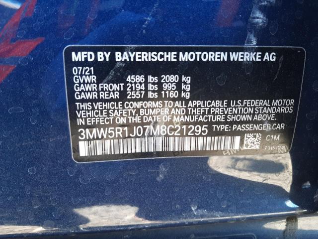 This 2021 BMW 3 Series (Blue) comes from a major insurance auction in the USA or Canada. All information on this page is linked to the vehicle’s VIN (3MW5R1J07M8C21295), which helps confirm where the car was listed and what condition it was in at the time of sale.