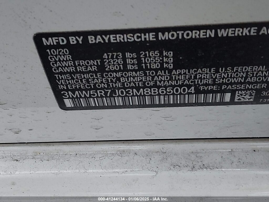 This 2021 BMW 3 Series (White) comes from a major insurance auction in the USA or Canada. All information on this page is linked to the vehicle’s VIN (3MW5R7J03M8B65004), which helps confirm where the car was listed and what condition it was in at the time of sale.