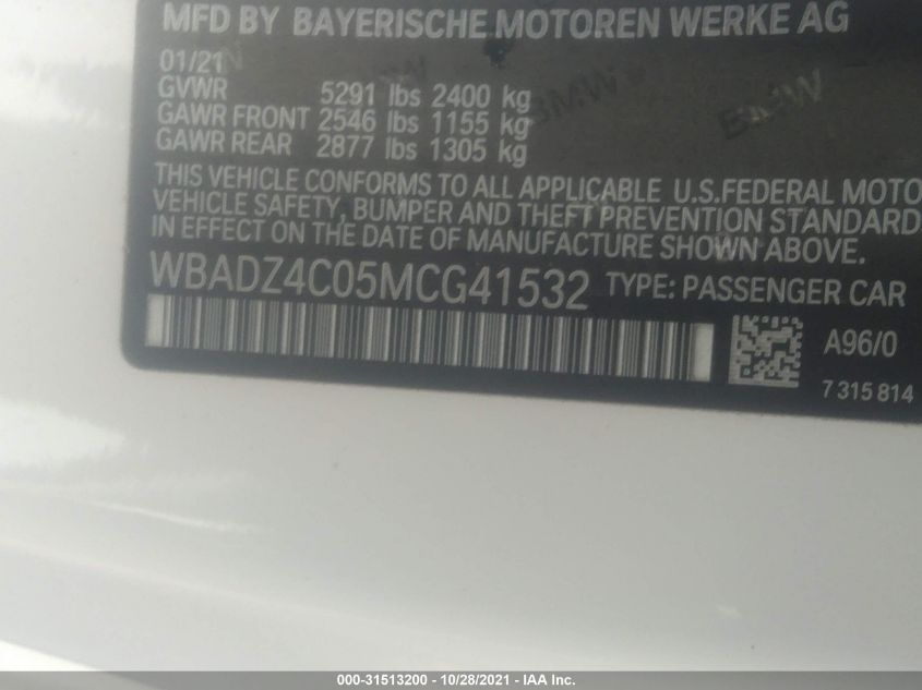 This 2021 BMW 8 Series (White) comes from a major insurance auction in the USA or Canada. All information on this page is linked to the vehicle’s VIN (WBADZ4C05MCG41532), which helps confirm where the car was listed and what condition it was in at the time of sale.