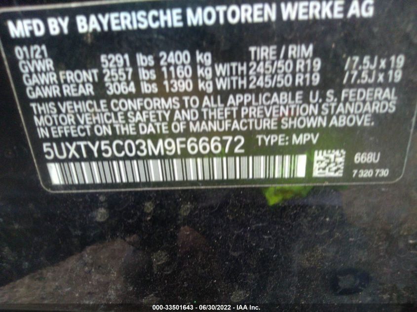 This 2021 BMW X3 (Black) comes from a major insurance auction in the USA or Canada. All information on this page is linked to the vehicle’s VIN (5UXTY5C03M9F66672), which helps confirm where the car was listed and what condition it was in at the time of sale.