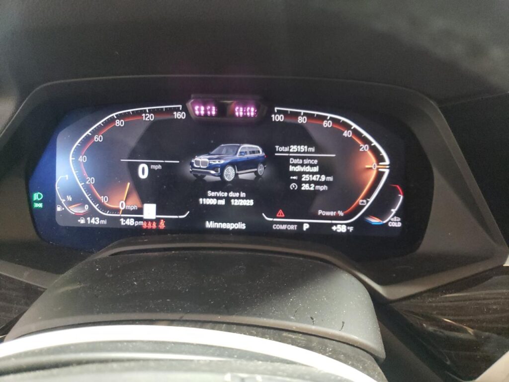 This 2021 BMW X7 (BLUE) is equipped with an engine designed to balance performance and efficiency. According to the auction listing, the vehicle had 25,147 miles at the time of sale.