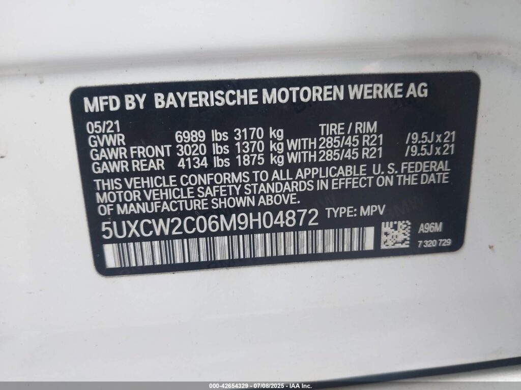 This 2021 BMW X7 (White) comes from a major insurance auction in the USA or Canada. All information on this page is linked to the vehicle’s VIN (5UXCW2C06M9H04872), which helps confirm where the car was listed and what condition it was in at the time of sale.