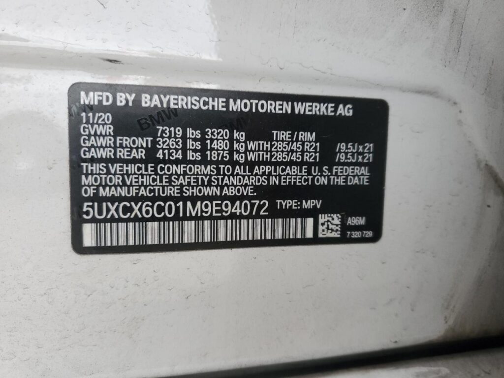 This 2021 BMW X7 (WHITE) comes from a major insurance auction in the USA or Canada. All information on this page is linked to the vehicle’s VIN (5UXCX6C01M9E94072), which helps confirm where the car was listed and what condition it was in at the time of sale.