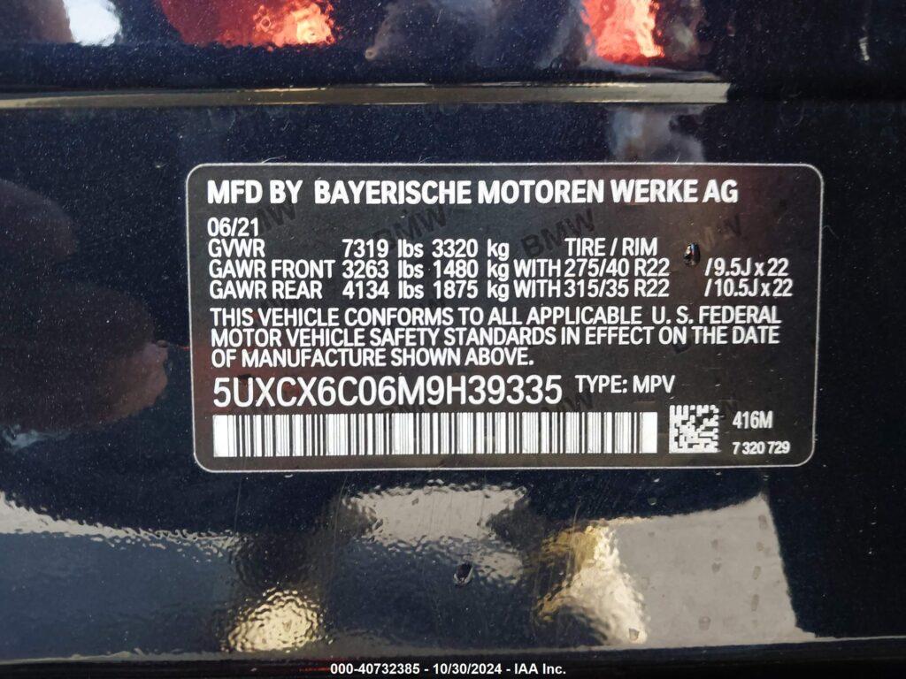This 2021 BMW X7 (Black) comes from a major insurance auction in the USA or Canada. All information on this page is linked to the vehicle’s VIN (5UXCX6C06M9H39335), which helps confirm where the car was listed and what condition it was in at the time of sale.