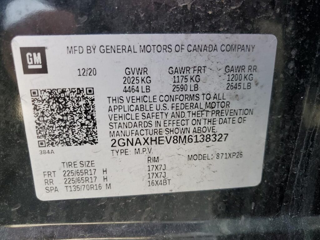 This 2021 Chevrolet Equinox (Black) comes from a major insurance auction in the USA or Canada. All information on this page is linked to the vehicle’s VIN (2GNAXHEV8M6138327), which helps confirm where the car was listed and what condition it was in at the time of sale.