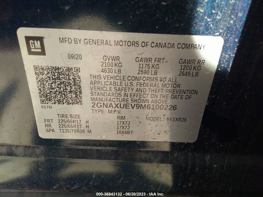 This 2021 Chevrolet Equinox (Other) comes from a major insurance auction in the USA or Canada. All information on this page is linked to the vehicle’s VIN (2GNAXUEV9M6100226), which helps confirm where the car was listed and what condition it was in at the time of sale.