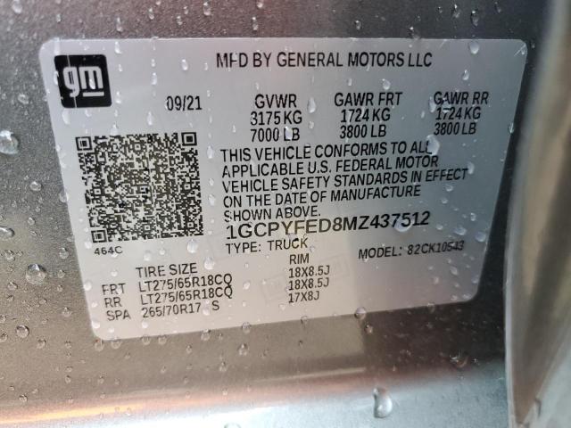 This 2021 Chevrolet Silverado (Grey) comes from a major insurance auction in the USA or Canada. All information on this page is linked to the vehicle’s VIN (1GCPYFED8MZ437512), which helps confirm where the car was listed and what condition it was in at the time of sale.