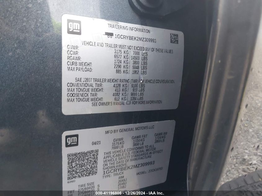 2021 CHEVROLET SILVERADO – 1GCRYBEK2MZ309993