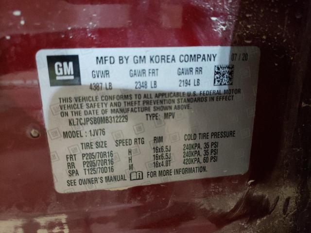 This 2021 Chevrolet Trax (Red) comes from a major insurance auction in the USA or Canada. All information on this page is linked to the vehicle’s VIN (KL7CJPSB0MB312229), which helps confirm where the car was listed and what condition it was in at the time of sale.