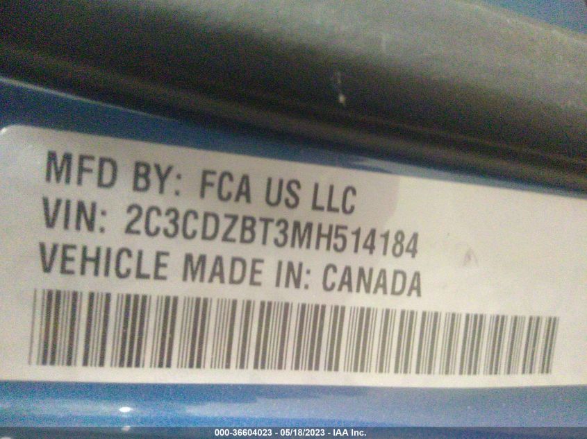 | VIN Number | 2C3CDZBT3MH514184 |