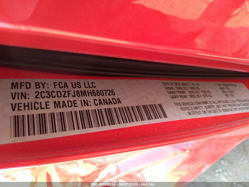 | VIN Number | 2C3CDZFJ8MH680726 |