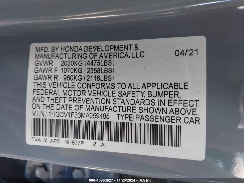 | VIN Number | 1HGCV1F33MA059485 |