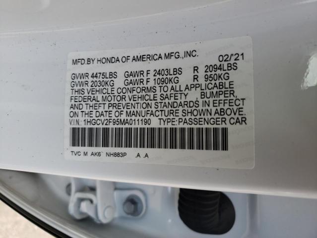 This 2021 Honda Accord (White) comes from a major insurance auction in the USA or Canada. All information on this page is linked to the vehicle’s VIN (1HGCV2F95MA011190), which helps confirm where the car was listed and what condition it was in at the time of sale.
