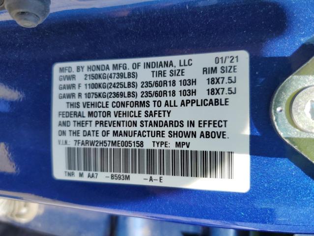 This 2021 HONDA CRV (BLUE) comes from a major insurance auction in the USA or Canada. All information on this page is linked to the vehicle’s VIN (7FARW2H57ME005158), which helps confirm where the car was listed and what condition it was in at the time of sale.