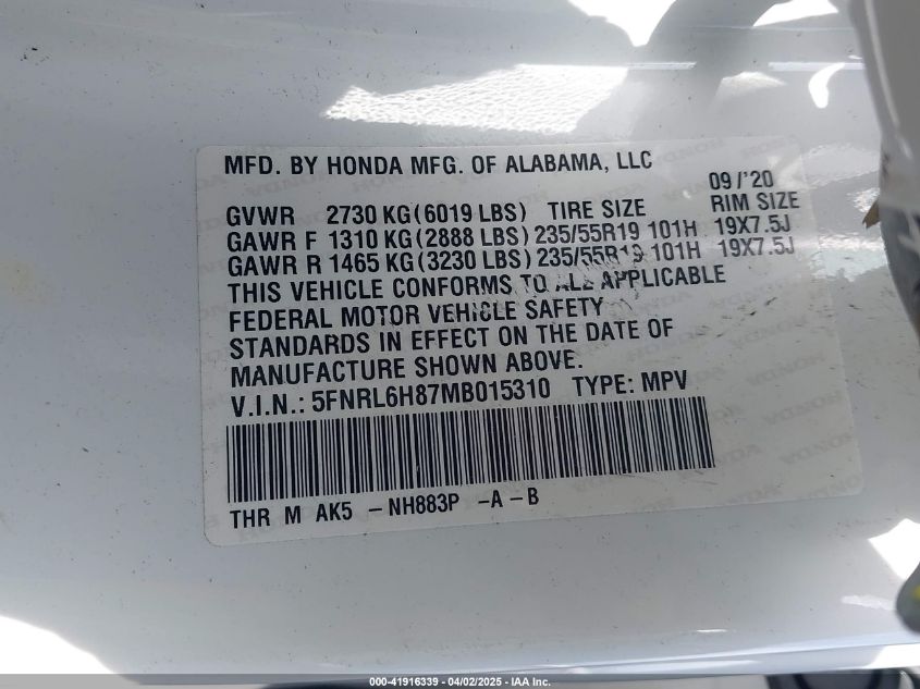 | VIN Number | 5FNRL6H87MB015310 |