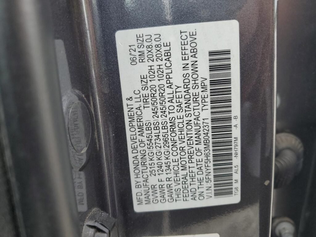 This 2021 Honda Pilot tour (GRAY) comes from a major insurance auction in the USA or Canada. All information on this page is linked to the vehicle’s VIN (5FNYF5H63MB042371), which helps confirm where the car was listed and what condition it was in at the time of sale.