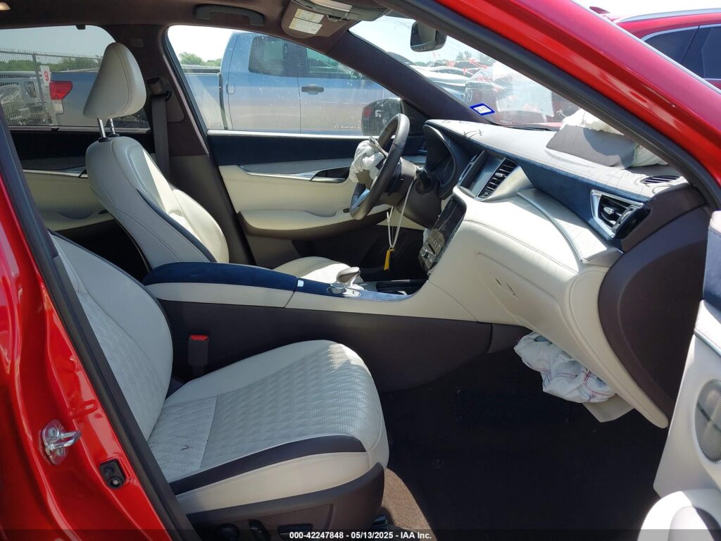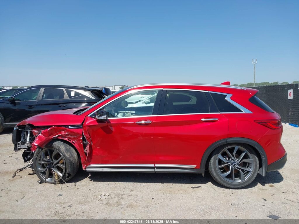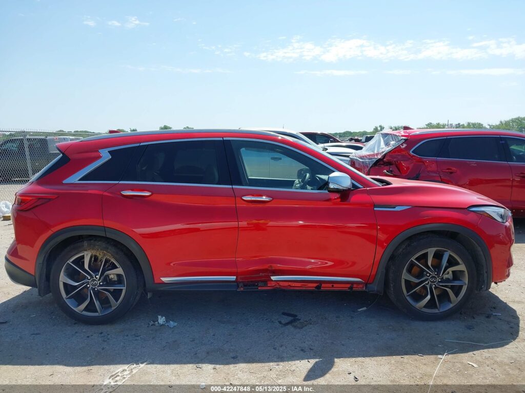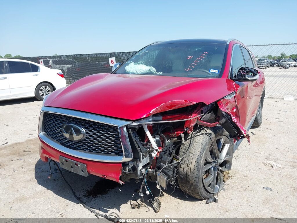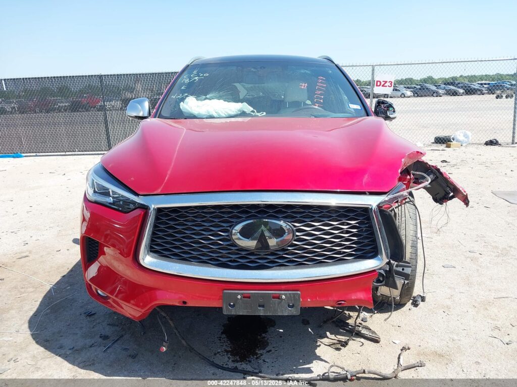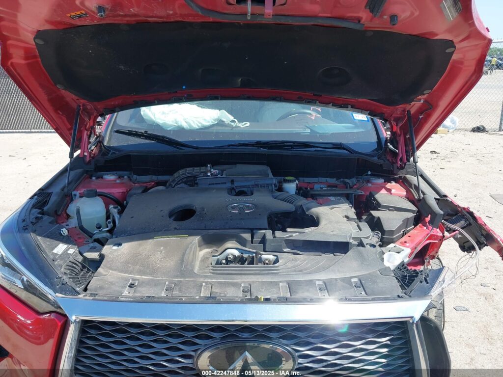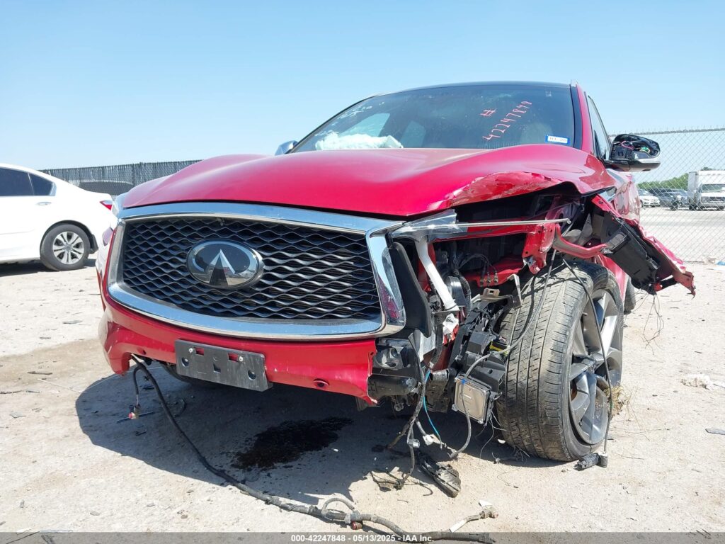 This 2021 Infiniti QX50 (Red) is equipped with an engine designed to balance performance and efficiency. According to the auction listing, the vehicle had 27,418 miles at the time of sale.