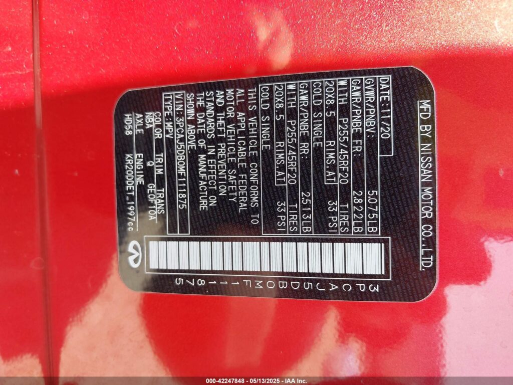 This 2021 Infiniti QX50 (Red) comes from a major insurance auction in the USA or Canada. All information on this page is linked to the vehicle’s VIN (3PCAJ5DB0MF111875), which helps confirm where the car was listed and what condition it was in at the time of sale.