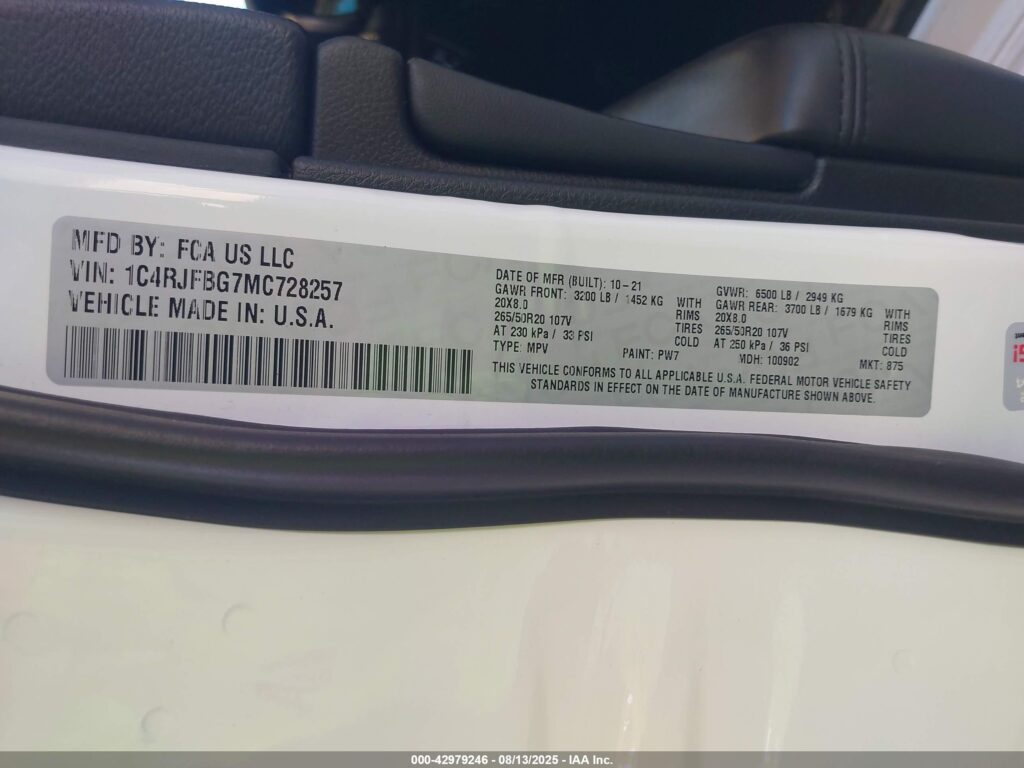 This 2021 Jeep Grand cherokee (White) comes from a major insurance auction in the USA or Canada. All information on this page is linked to the vehicle’s VIN (1C4RJFBG7MC728257), which helps confirm where the car was listed and what condition it was in at the time of sale.