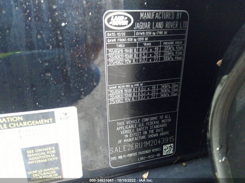 This 2021 Land Rover Defender (Black) comes from a major insurance auction in the USA or Canada. All information on this page is linked to the vehicle’s VIN (SALE2ERU1M2043915), which helps confirm where the car was listed and what condition it was in at the time of sale.