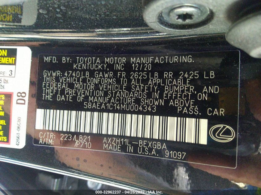 This 2021 Lexus ES 300h (Black) comes from a major insurance auction in the USA or Canada. All information on this page is linked to the vehicle’s VIN (58AEA1C14MU004343), which helps confirm where the car was listed and what condition it was in at the time of sale.