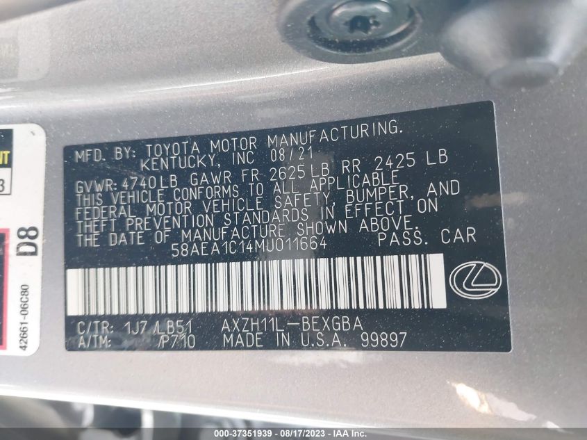 This 2021 LEXUS ES (Unknown) comes from a major insurance auction in the USA or Canada. All information on this page is linked to the vehicle’s VIN (58AEA1C14MU011664), which helps confirm where the car was listed and what condition it was in at the time of sale.