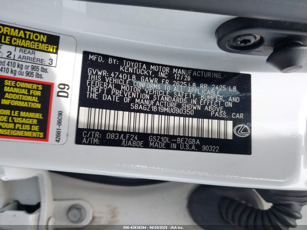 This 2021 Lexus ES350 (White) comes from a major insurance auction in the USA or Canada. All information on this page is linked to the vehicle’s VIN (58AGZ1B19MU090350), which helps confirm where the car was listed and what condition it was in at the time of sale.