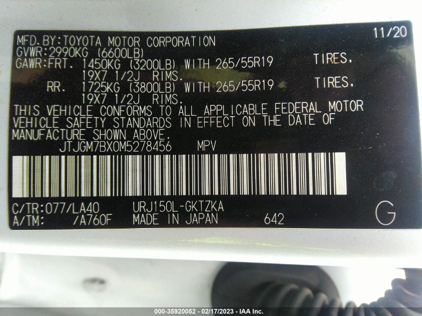 VIN: JTJGM7BX0M5278456