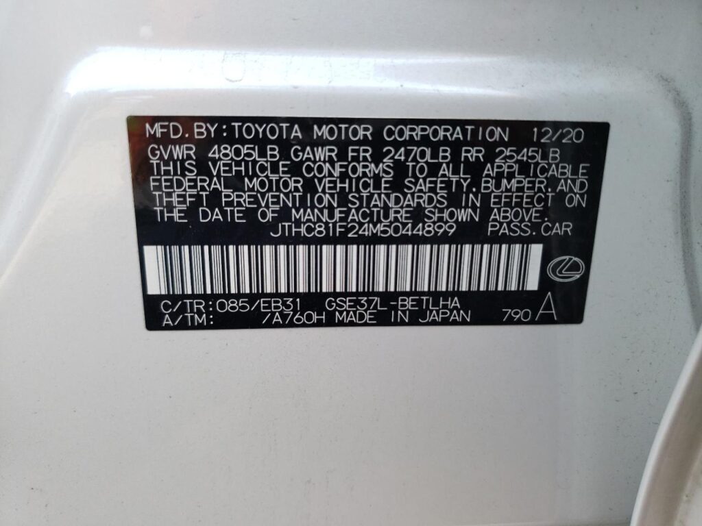 This 2021 LEXUS IS (WHITE) comes from a major insurance auction in the USA or Canada. All information on this page is linked to the vehicle’s VIN (JTHC81F24M5044899), which helps confirm where the car was listed and what condition it was in at the time of sale.
