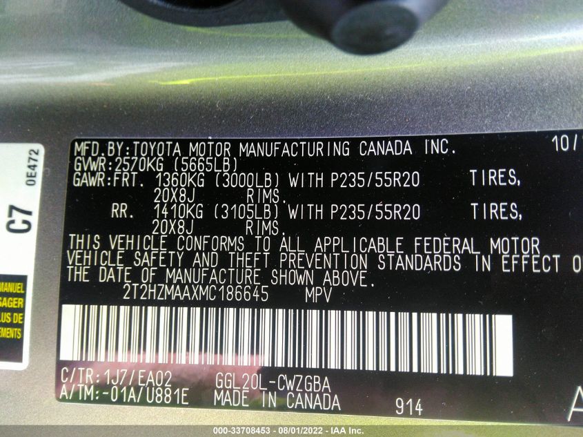 | VIN Number | 2T2HZMAAXMC186645 |