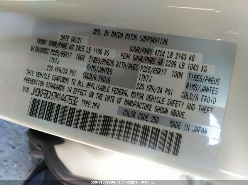 This 2021 Mazda CX-5 (White) comes from a major insurance auction in the USA or Canada. All information on this page is linked to the vehicle’s VIN (JM3KFBCM7M1447532), which helps confirm where the car was listed and what condition it was in at the time of sale.