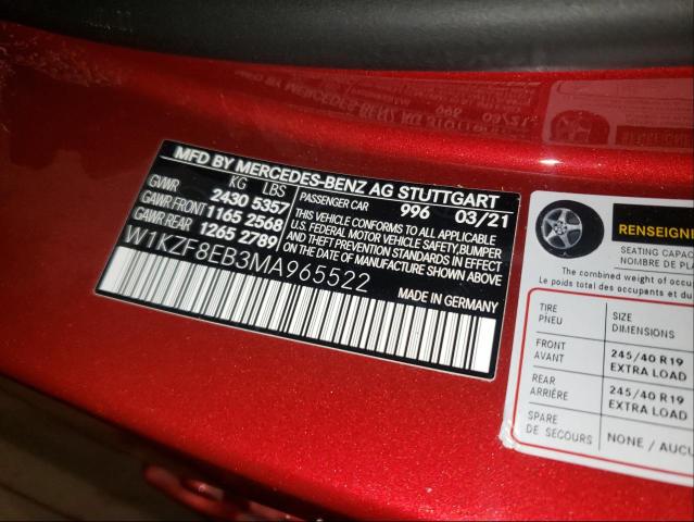 This 2021 Mercedes-Benz E-Class (Red) comes from a major insurance auction in the USA or Canada. All information on this page is linked to the vehicle’s VIN (W1KZF8EB3MA965522), which helps confirm where the car was listed and what condition it was in at the time of sale.