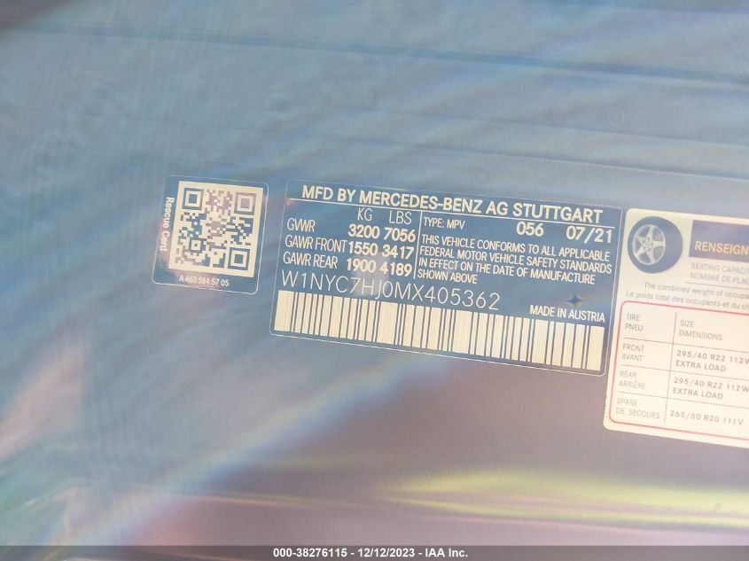 This 2021 Mercedes-Benz G-Class (Black) comes from a major insurance auction in the USA or Canada. All information on this page is linked to the vehicle’s VIN (W1NYC7HJ0MX405362), which helps confirm where the car was listed and what condition it was in at the time of sale.
