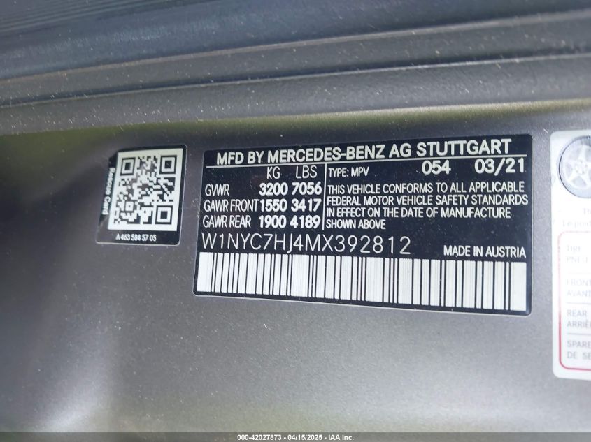 This 2021 MERCEDES-BENZ G-CLASS (Unknown Color) comes from a major insurance auction in the USA or Canada. All information on this page is linked to the vehicle’s VIN (W1NYC7HJ4MX392812), which helps confirm where the car was listed and what condition it was in at the time of sale.