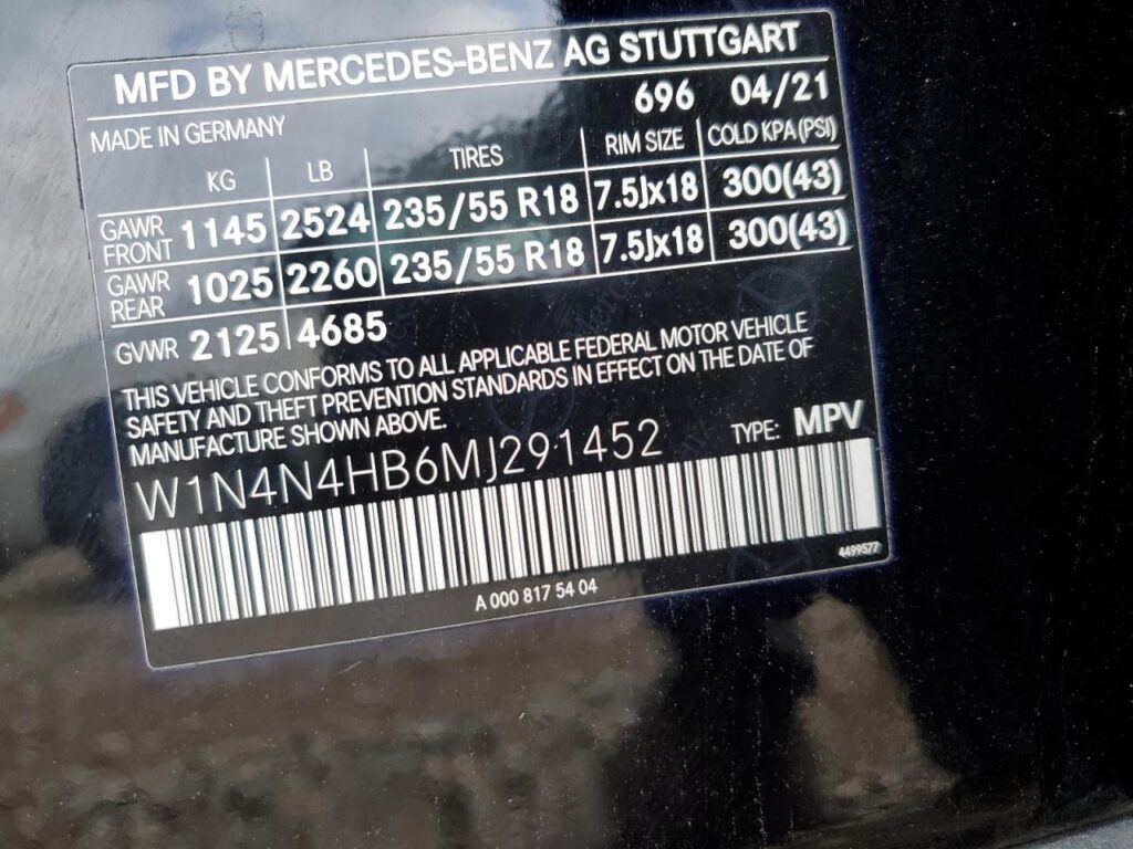 | VIN Number | W1N4N4HB6MJ291452 |