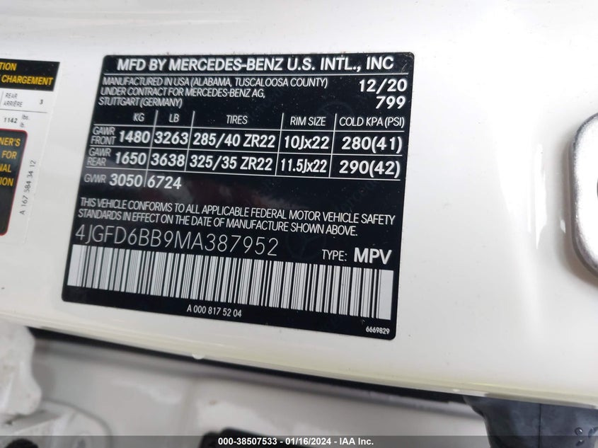 This 2021 Mercedes-Benz GLE-Class (White) comes from a major insurance auction in the USA or Canada. All information on this page is linked to the vehicle’s VIN (4JGFD6BB9MA387952), which helps confirm where the car was listed and what condition it was in at the time of sale.